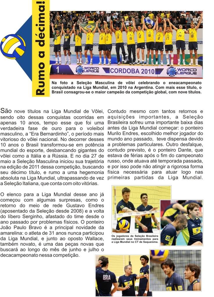O elenco para a Liga Mundial desse ano já começou com algumas surpresas, como o retorno do meio de rede Gustavo Endres (aposentado da Seleção desde 2008) e a volta do líbero Serginho, afastado do time desde o ano passado por problemas físicos. O ponteiro João Paulo Bravo é a principal novidade da amarelina: o atleta de 31 anos nunca participou da Liga Mundial, e junto ao oposto Wallace, também novato, é uma das peças novas no elenco que buscará ao longo do mês de junho e julho o decacampeonato nessa competição.