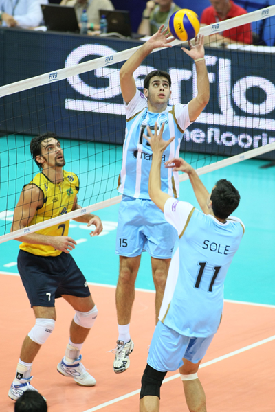Murilo iniciou o 1º set com um saque forçado, mas o primeiro ponto foi da Argentina em um bloqueio brasileiro que foi para fora. O equilíbrio prevaleceu no começo da parcial, mas na passagem de Giba pelo saque a Seleção Brasileira conseguiu abrir vantagem, e em um erro de Pereyra foi para o primeiro tempo técnico com 8 a 5. A Argentina direcionava seus ataques e saques em cima do capitão brasileiro, tentando logo no princípio anular seu jogo. E em um saque forçado em cima de Giba, que teve dificuldade em defender, deixou a Argentina pontuar e passar no placar: 11 a 9. O Brasil tornou a liderar na passagem de Théo no saque, e com boas atuações de Lucão e uma bola de meio fundo de Giba, o time comandado por Bernardinho foi para a segunda parada técnica na frente: 16 a 13. A Argentina reagiu especialmente com sua revelação, Facundo Conte, encostando no placar, contudo Théo cresceu muito no final do set, ajudando o Brasil a finalizar: 25 a 22.